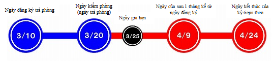 Ví dụ: Trường hợp hợp đồng của Quý khách được gia hạn vào ngày 25 hàng tháng, vì 9/4 (là ngày sau 1 tháng kể từ ngày đăng ký trả phòng) đã sang 1 kỳ mới nên Quý khách sẽ phải thanh toán toàn bộ phí sử dụng của kỳ đó